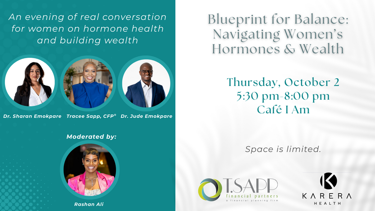 You are invited to a curated evening for high-achieving women seeking clarity and confidence in hormone health and financial strategies to build and preserve their wealth. Presented by T. Sapp Financial Partners and Karera Health:
